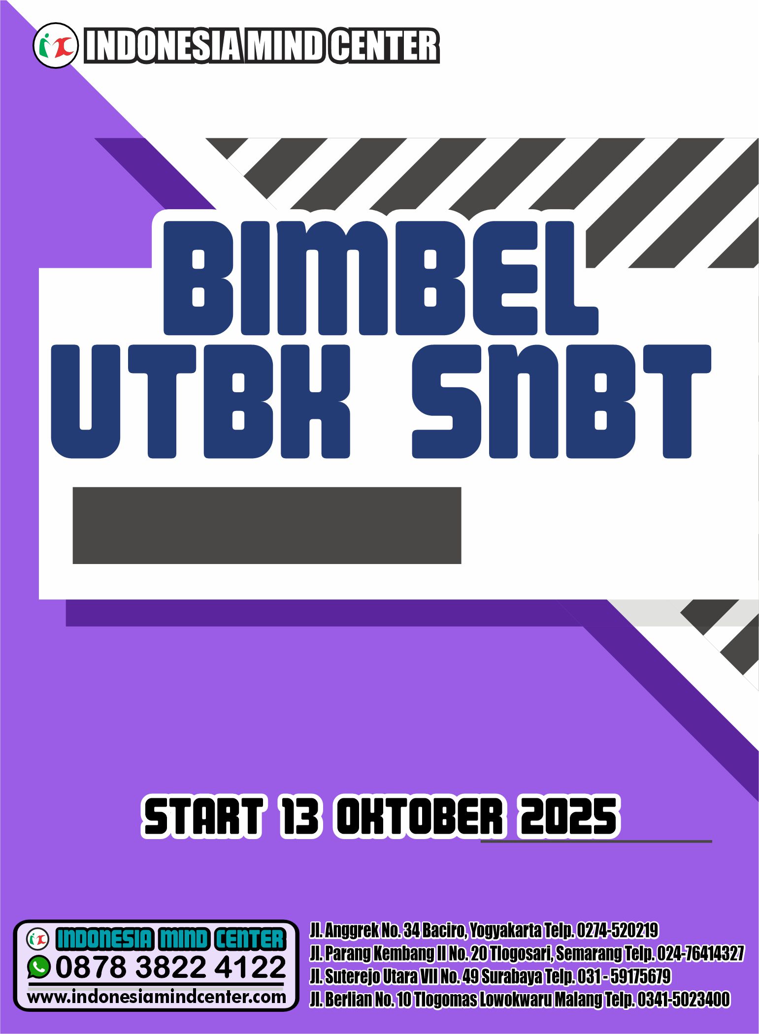 Adik adik tak perlu risau, kami sudah menyiapkan semua, bergabunglah bersama kami bimbel utbk snbt master kedokteran LPBB INDONESIA MIND CENTER program jaminan genius, dengan pengajar dosen, s2 ugm, pengajar terbaik di jogja, dan master skolastik, ahli penalaran matematika, ahli literasi bahasa, master tpa, master toefl, juara olimpiade siap membimbing adik adik meraih ptn sesuai jurusan yang adik inginkan, adik adik tidak hanya di bekali seluruh materi ujian, tetapi akan di bekali cara penyelesaian soal tercepat, dan passing grade meraih ptn beserta jurusannya, sehingg adik adik mampu mengerjakan soal ujian utbk dengan benar dan sesuai waktu yang di tentukan